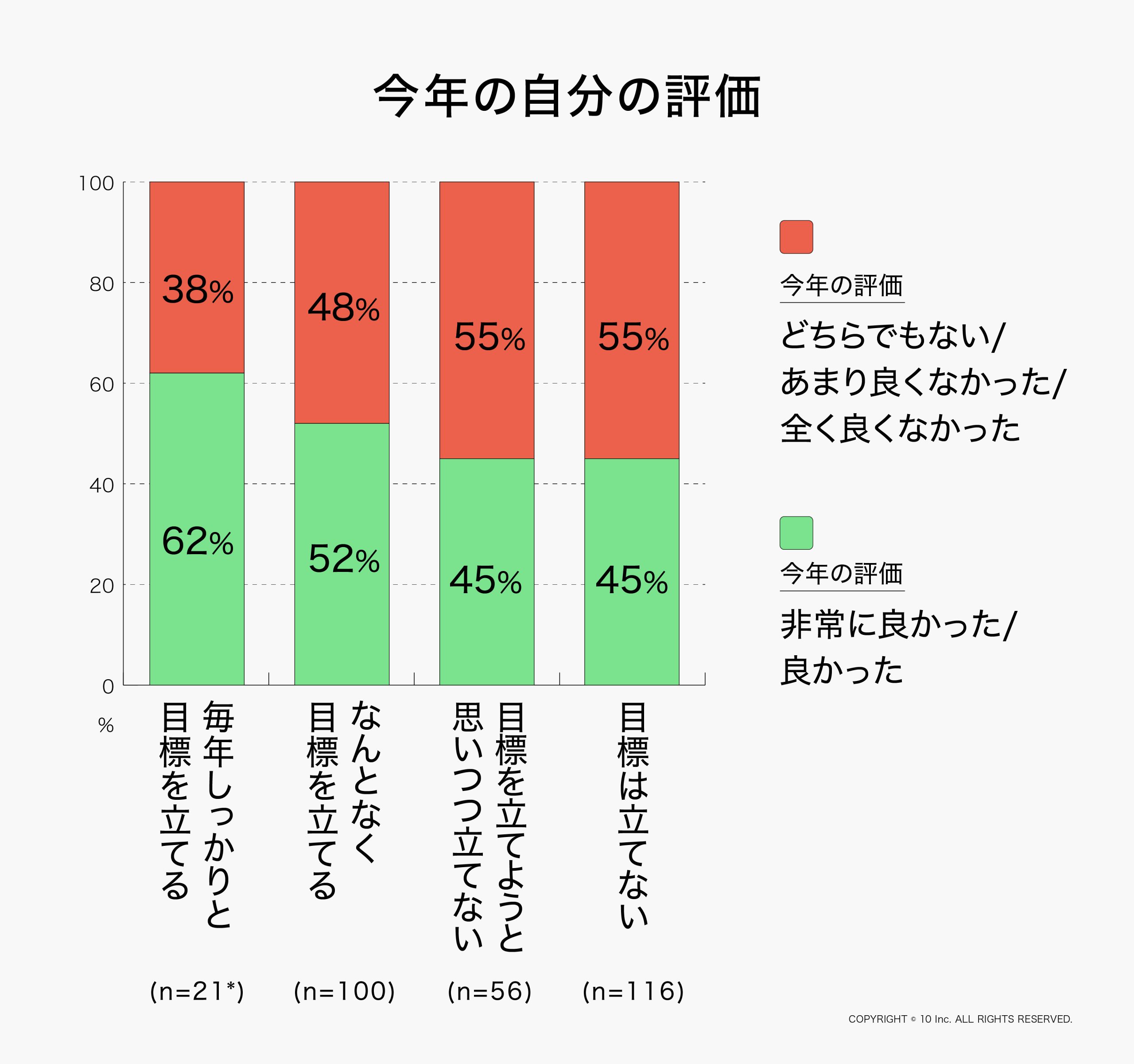 この結果だけを見ると、「年始に目標を立てた方が、その年を充実したものとして感じやすい」と言えそうです。